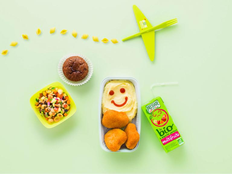 In all Air France cabins, on flights longer than 2.5 hours*, children aged between 2 to 8 years will be served a special kids meal: a fresh salad, a baked dish, soft white bread, apple juice, fruit compote... With Air France, your child enjoys an organic meal** adapted to his or her tastes and needs, served in a fun and easy-to-use food tray!