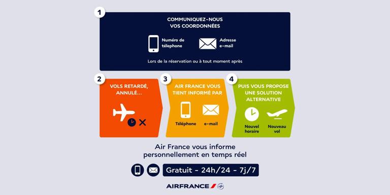 * Dès 14 jours avant le vol et jusqu'à l'heure du départ, pour un vol effectué par Air France, Joon, HOP!, Air Corsica ou CityJet. Pour les vols Air France effectués par l'une des compagnies membres de l'alliance SkyTeam, nous vous contactons jusqu'à 3 h avant le départ du vol.